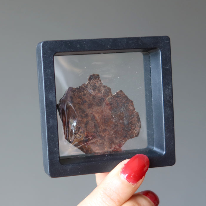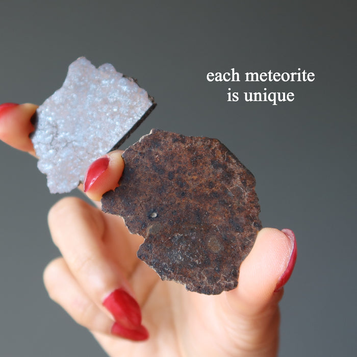 Your natural, untreated NWA Chondrites is a thinly sliced specimen of space. It has ochre and brown tones with unique patterns. Each one is unique. Meteorites are measured from the longest length, tip to tip. Your meteorites arrive in a zero-gravity display case.