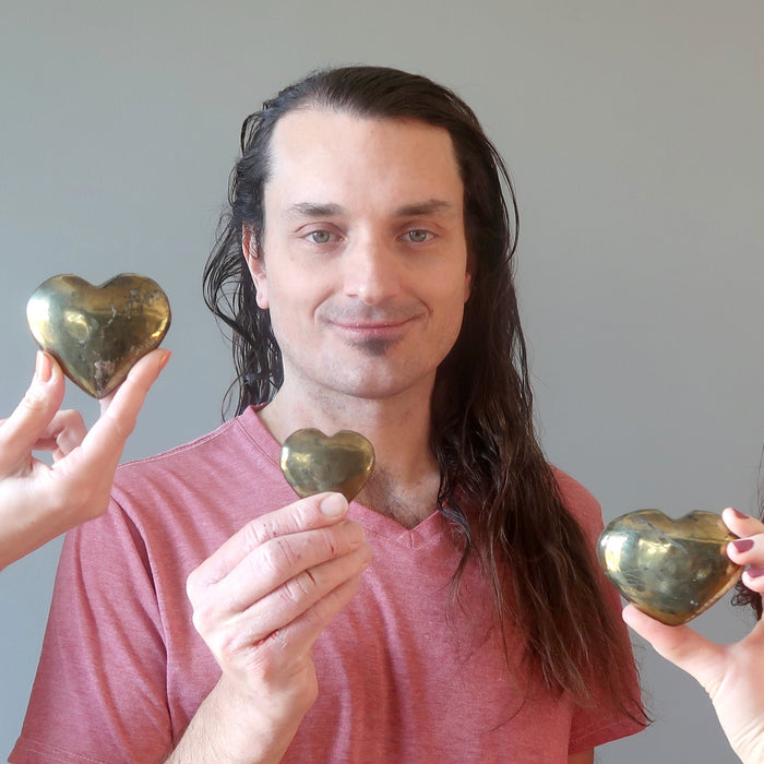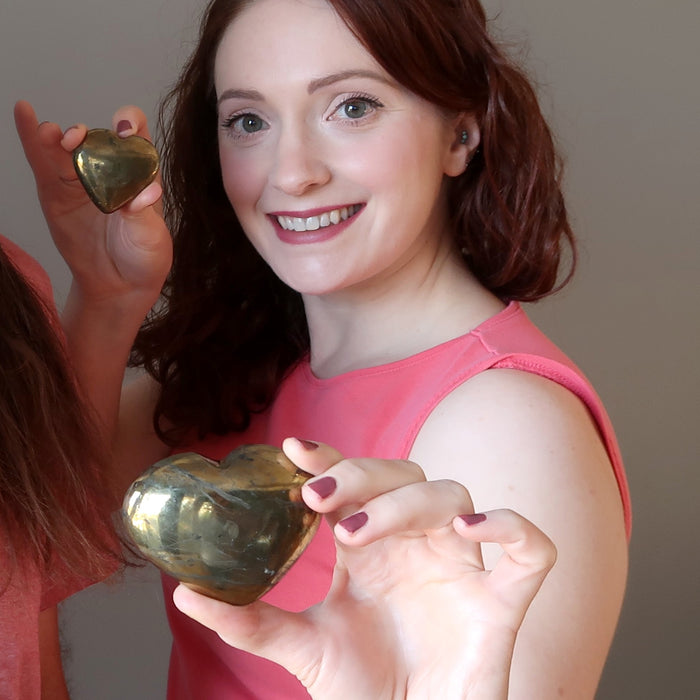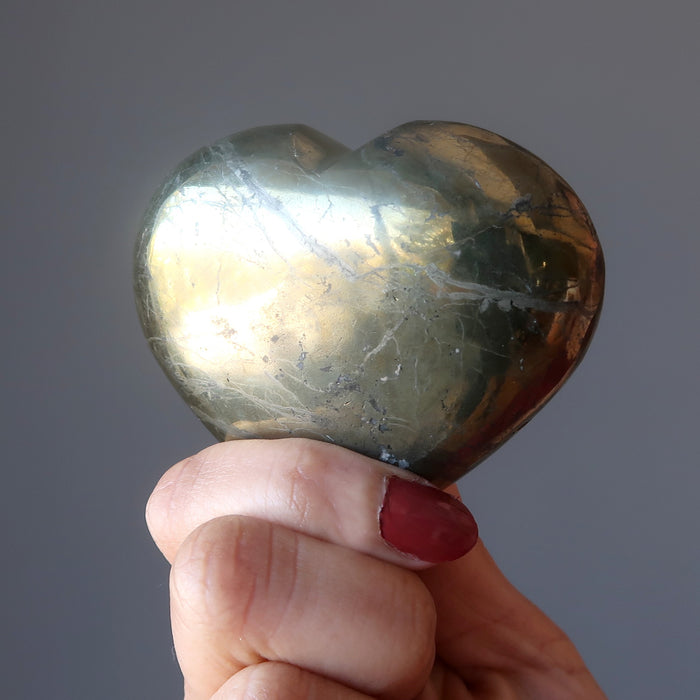 Your new heart is polished from natural and untreated Chalcopyrite. This is a metallic gold stone full of natural nooks, crannies, and rivers. The stone is polished into a puffy heart. Each stone differs. Hearts are measured by width.
