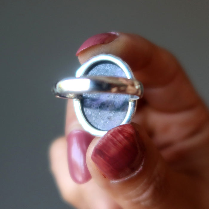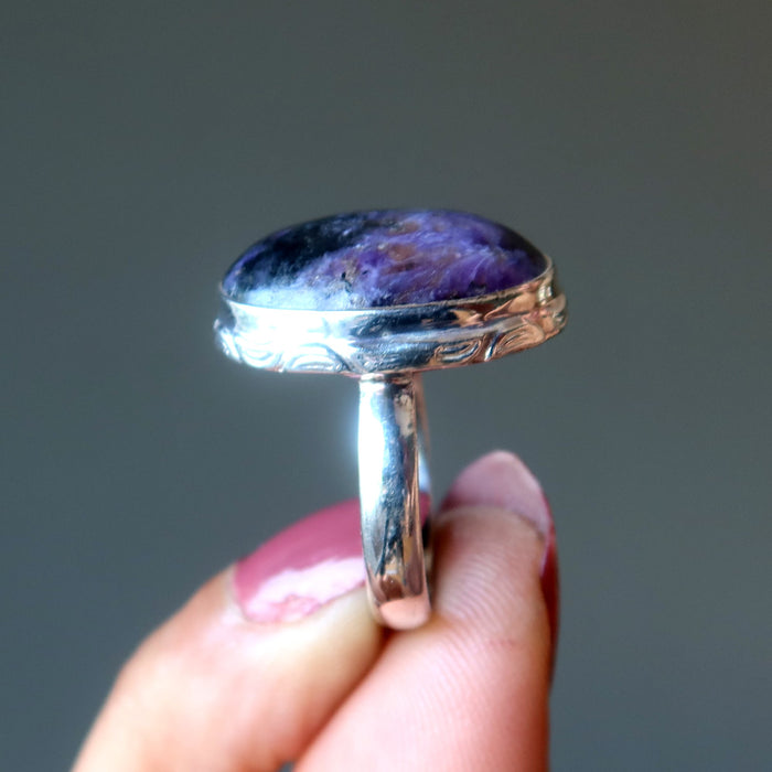 Your ring features natural and untreated Charoite from Russia. This is a deep purple gemstone with black mineral inclusions polished into an oval and set in sterling silver. This is a one-of-a-kind ring.