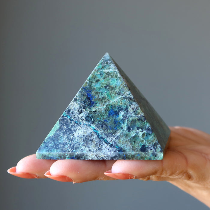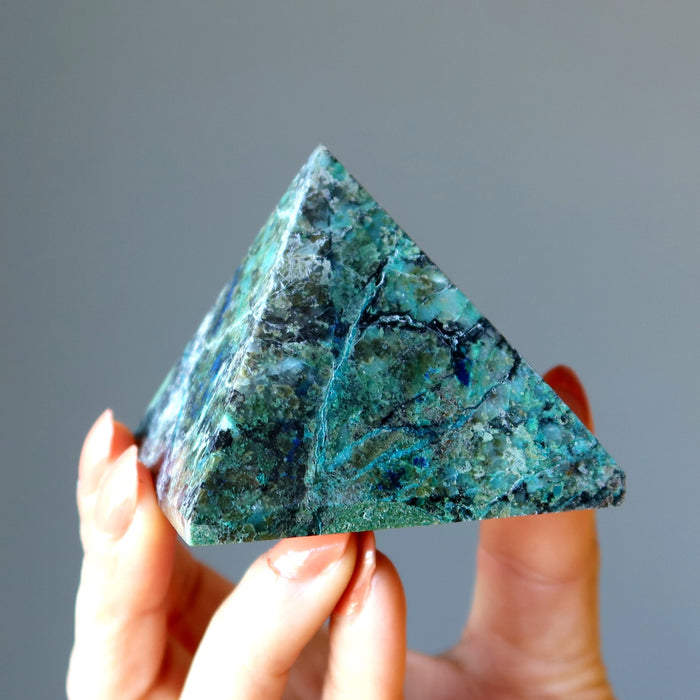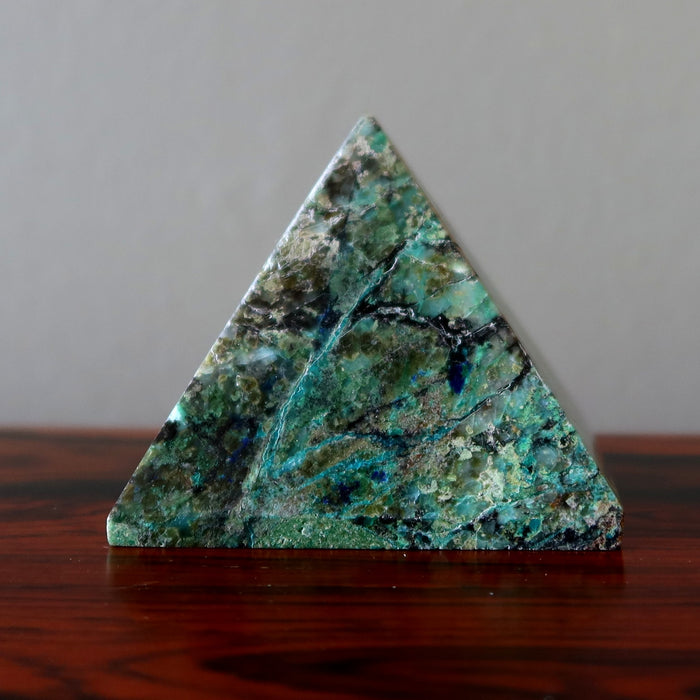 You have selected a natural Chrysocolla pyramid. This is a blue-green stone with green Malachite and blue Azurite inclusions. Being an organic stone, your pyramid will show rough and rugged patches on the surface and edges.