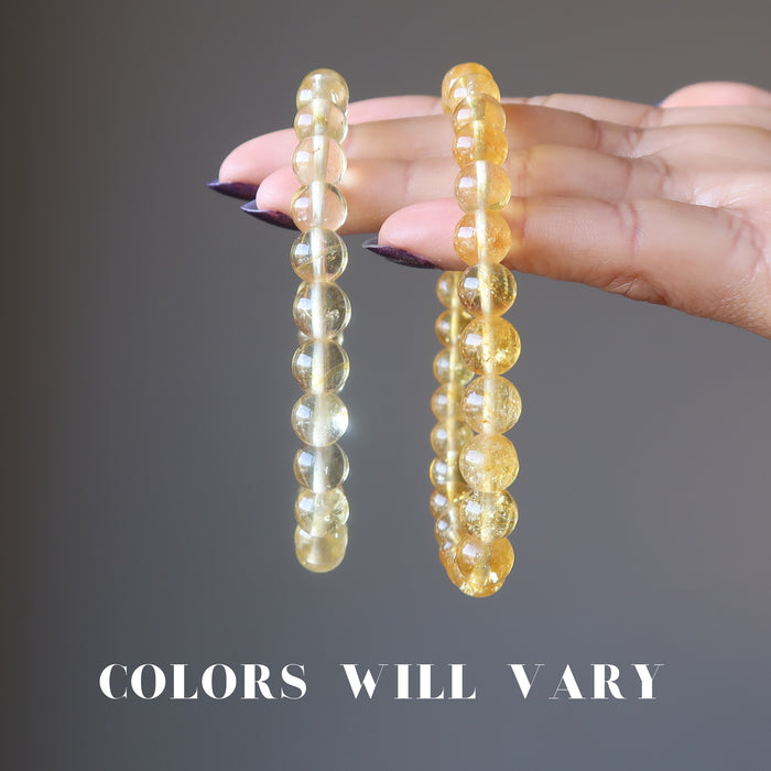 Your bracelet showcases heated Citrine gems on a sturdy elastic stretch cord. The translucent yellow stones vary in color intensity and are polished into roundish beads. Some stones are purely heated Amethyst, while others may have been dyed, depending on the strand. Each stone differs. Beaded in the Satin Crystals studio in the USA.
