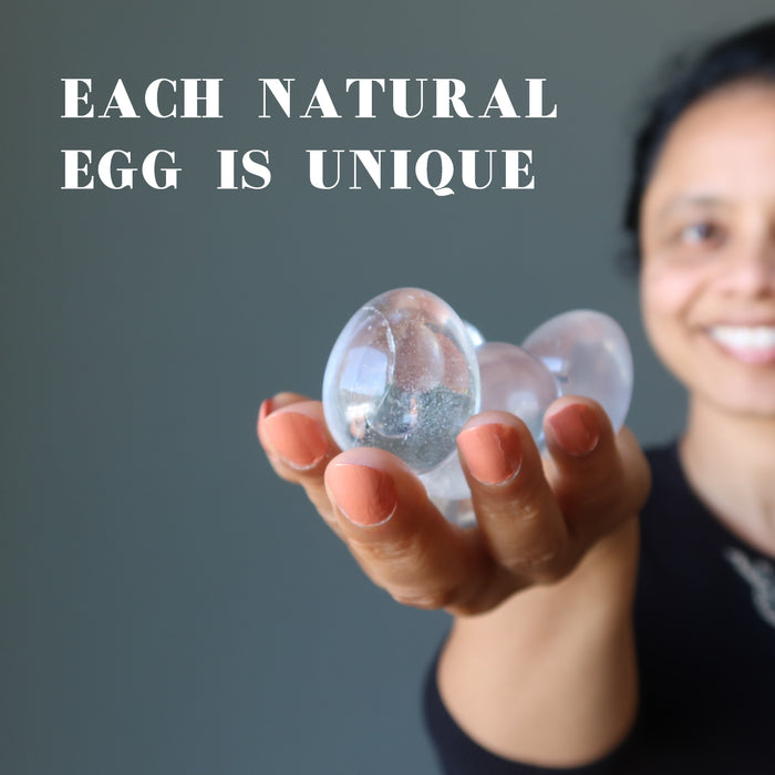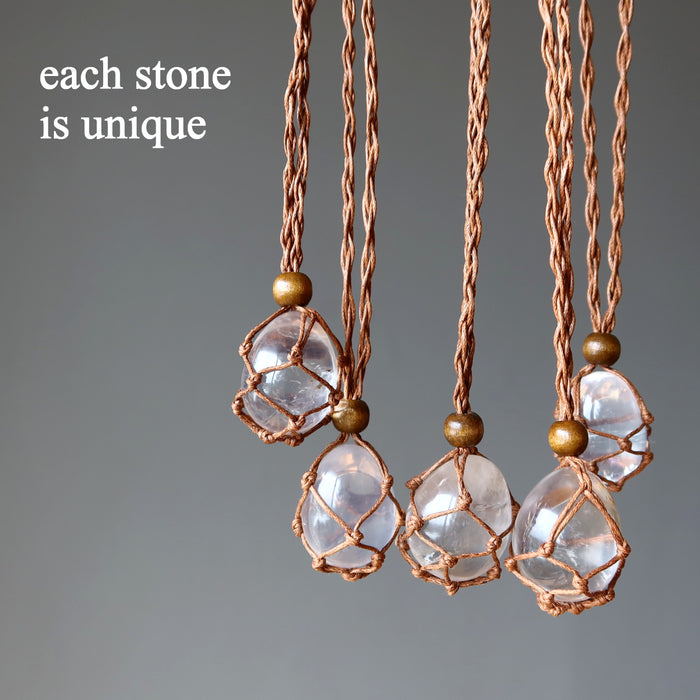 Your new necklace features a natural and untreated Quartz. This is a clear stone with organic inclusions polished into an egg shape. The egg is secured in an adjustable brown macrame necklace, and the stone can be changed out at will. Each stone differs. Assembled in the Satin Crystals studio in the USA.