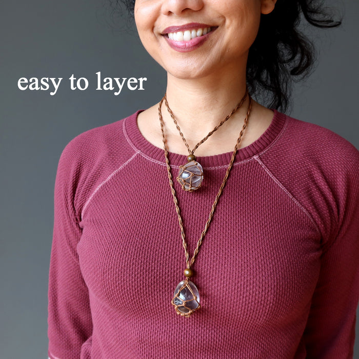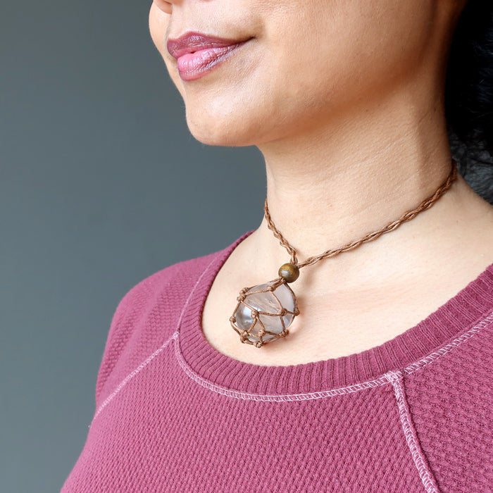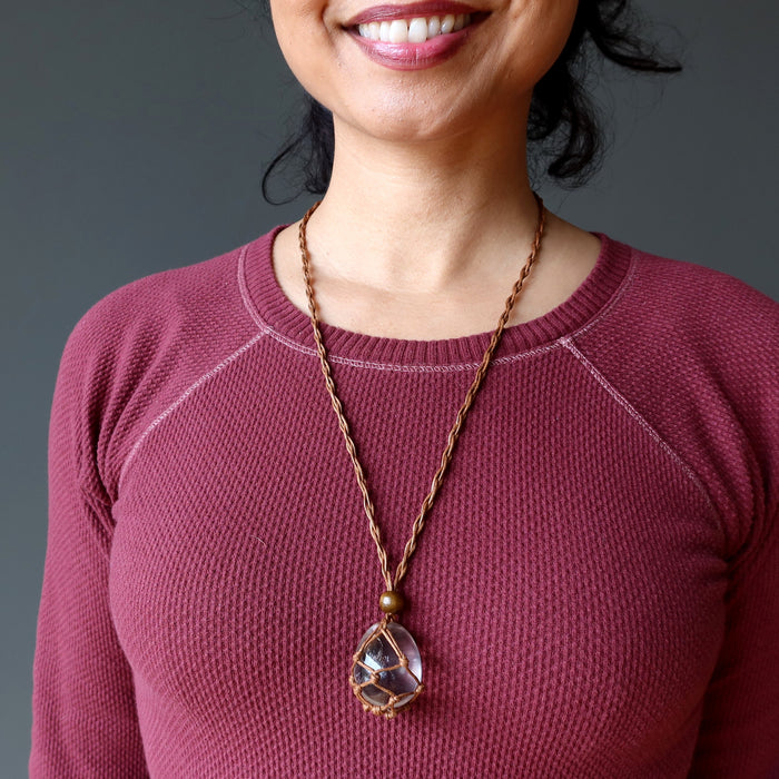 This Clear Quartz necklace features a beautiful crystal egg nested in brown macrame. When you want to grow your soul, this interesting piece encourages you to evolve and enlighten.