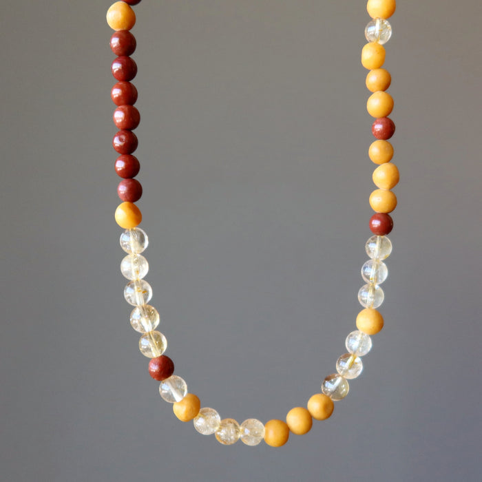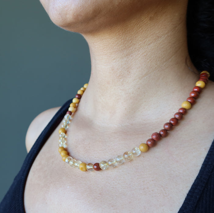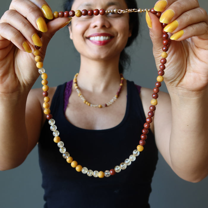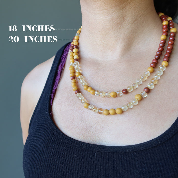 Your new necklace features Citrine and Jasper. The Citrine stones are heated, translucent, and pale yellow with natural inclusions. The Jasper is a bright, matte yellow brick red stone. The roundish beads are strung on professional necklace wire secured with a lobster claw clasp. Each necklace is beaded in the satin Crystals studio in the USA.