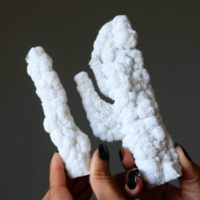 Your new stalactite features natural and untreated white Druzy Quartz forming over a translucent green Moss Agate center. Each stone is a natural cave formation from India.