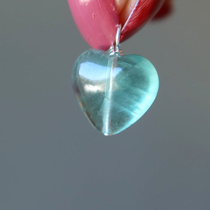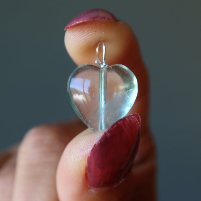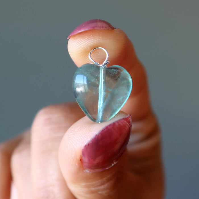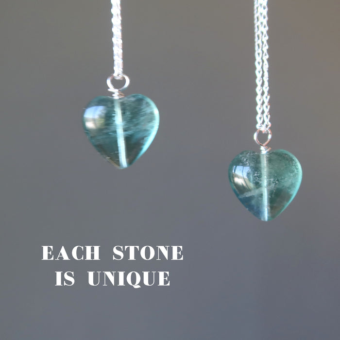 Your new necklace features natural and untreated Fluorite. This is a 14mm translucent blue heart-shaped gemstone hanging from a sterling silver chain. Each stone is unique. Beaded in the Satin Crystals studio in the USA.