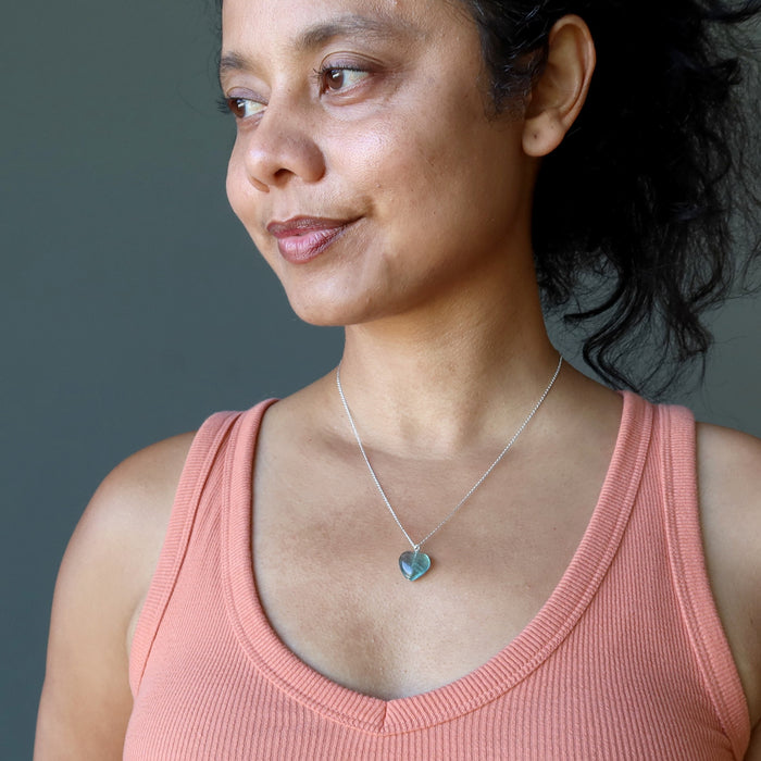 You are the beauty next door wearing this glistening, rare blue Fluorite heart necklace. Catch the attention of friends, lovers, and perfect strangers as you dance through life adorned with the best jewels. The Fluorite heart necklace makes you feel mighty fine.