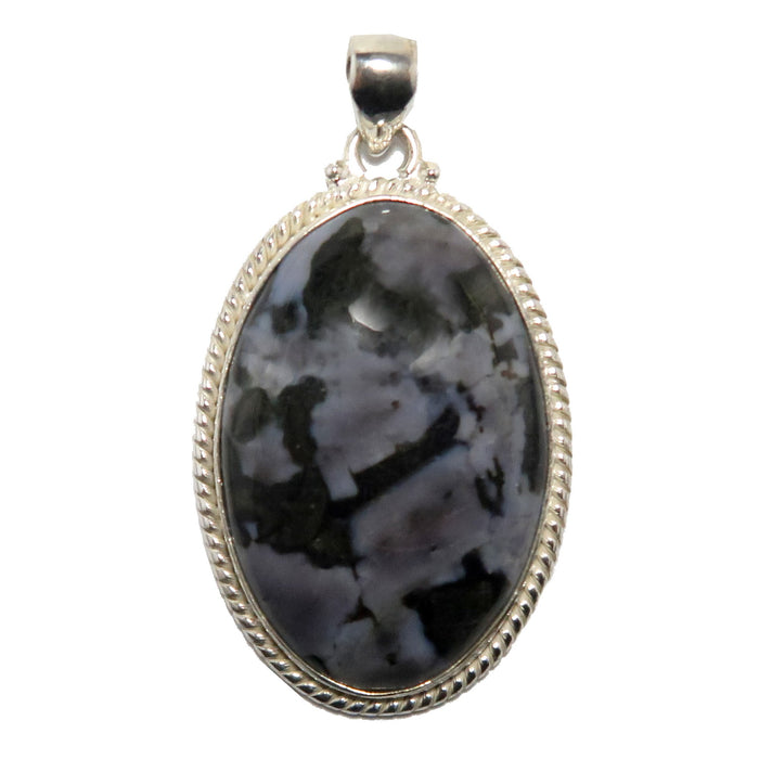 Your new pendant is polished from natural Indigo Gabbro. The stone has a unique blue and purple pattern swimming in a black matrix. It is polished into an oval and set in a sterling silver charm.