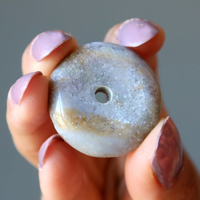 Your new crystal donut is polished from natural Agate. This is a mottled sage green and gray stone with spots of yellow or brown. May have organic caves and veins.