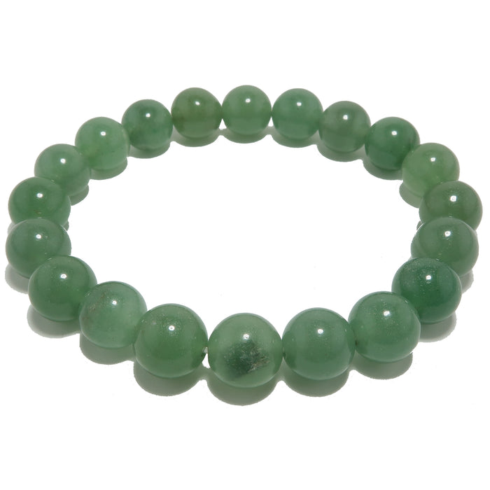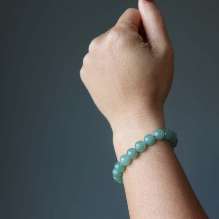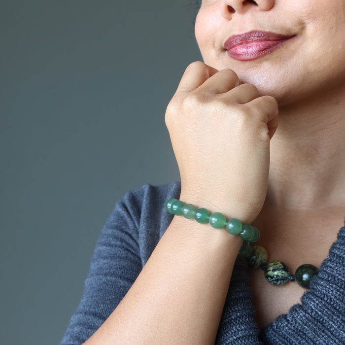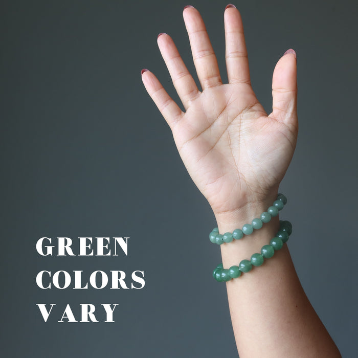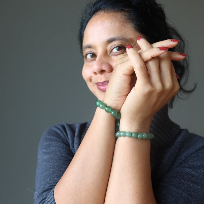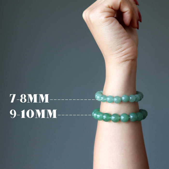 Your bracelet showcases natural Aventurine gems on a sturdy elastic stretch cord. The green stones vary in color intensity and are polished into roundish beads. Each stone differs. Beaded in the Satin Crystals studio in the USA.