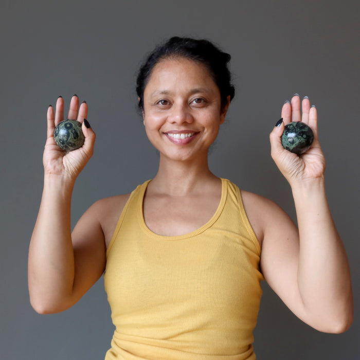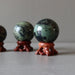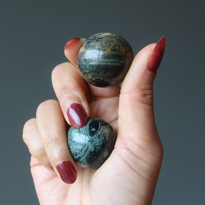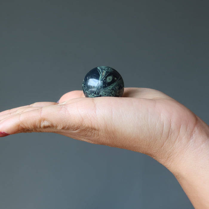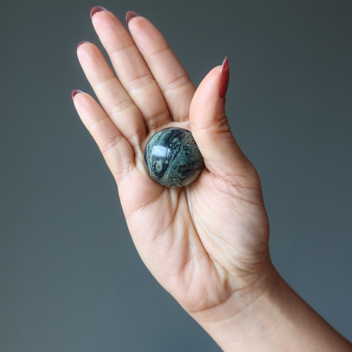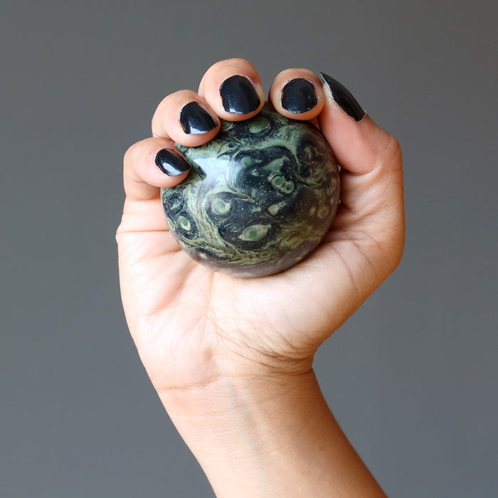 Your crystal ball features natural and untreated Kambaba Jasper. The stone has green tones, crocodile eye patterns, and unique mineral inclusions. Each sphere differs. Showcase your crystal ball by adding a display stand.
