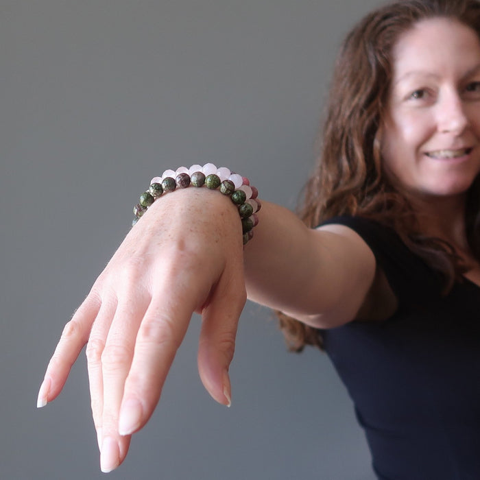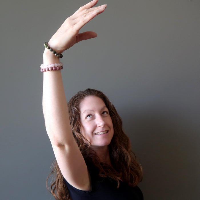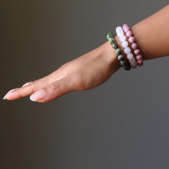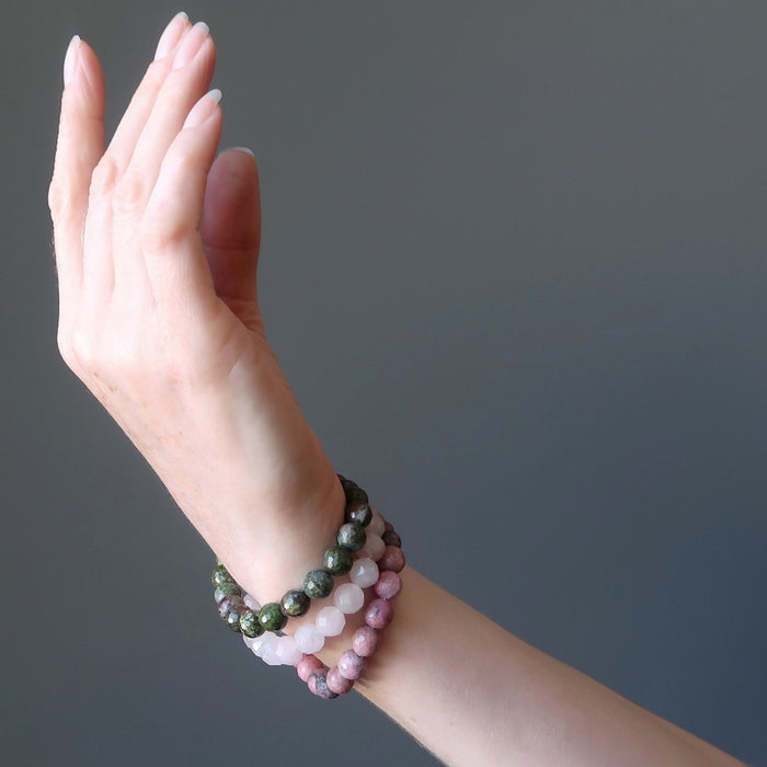 Your new bracelet set includes translucent pink Rose Quartz, dark pink Rhodonite, and mottled blue-green Chrysocolla showing red Cuprite. The natural and untreated gemstones are faceted into round beads on an elastic stretch cord. Each is unique. Beaded in the Satin Crystals studio in the USA.