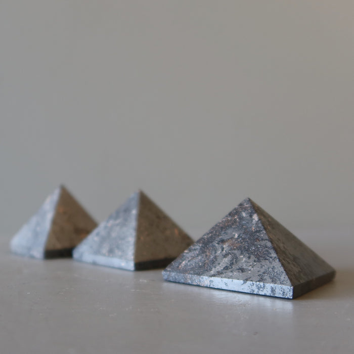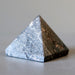 Your new pyramid features a natural and untreated Hematite. This is a metallic silver stone with organic spots and veins. Pyramids are measured by width; height will vary. Each stone is unique.