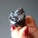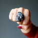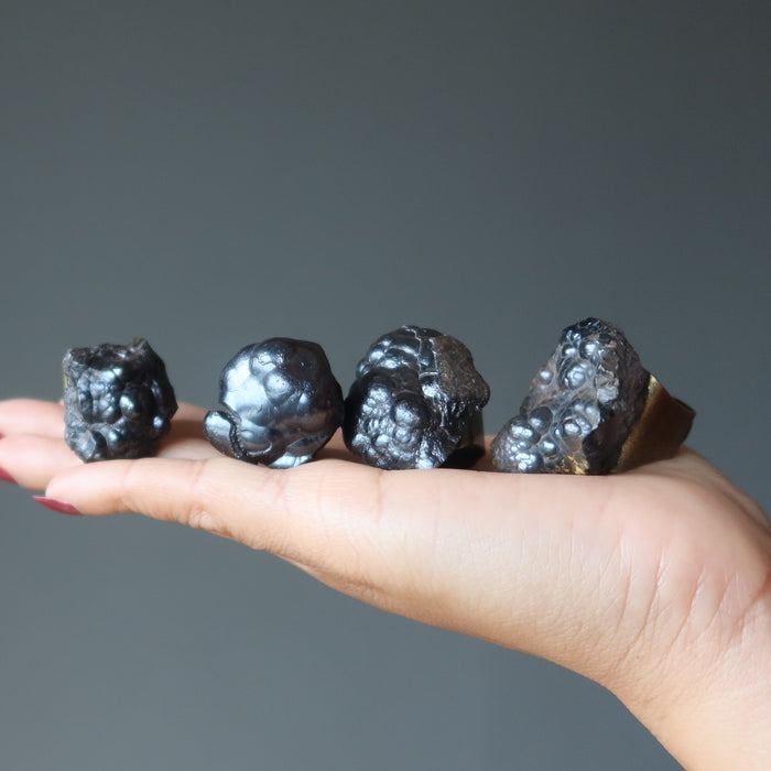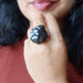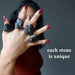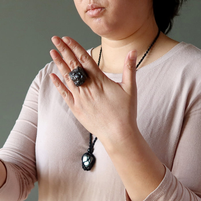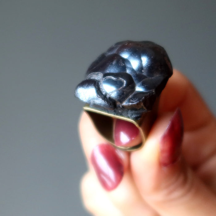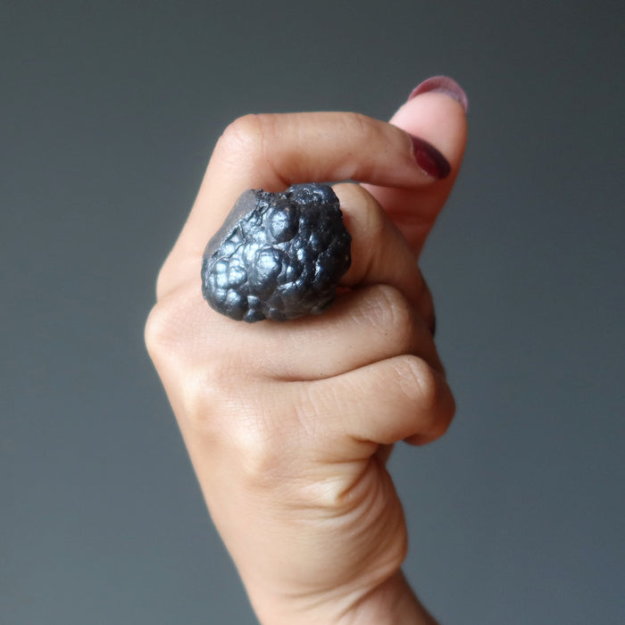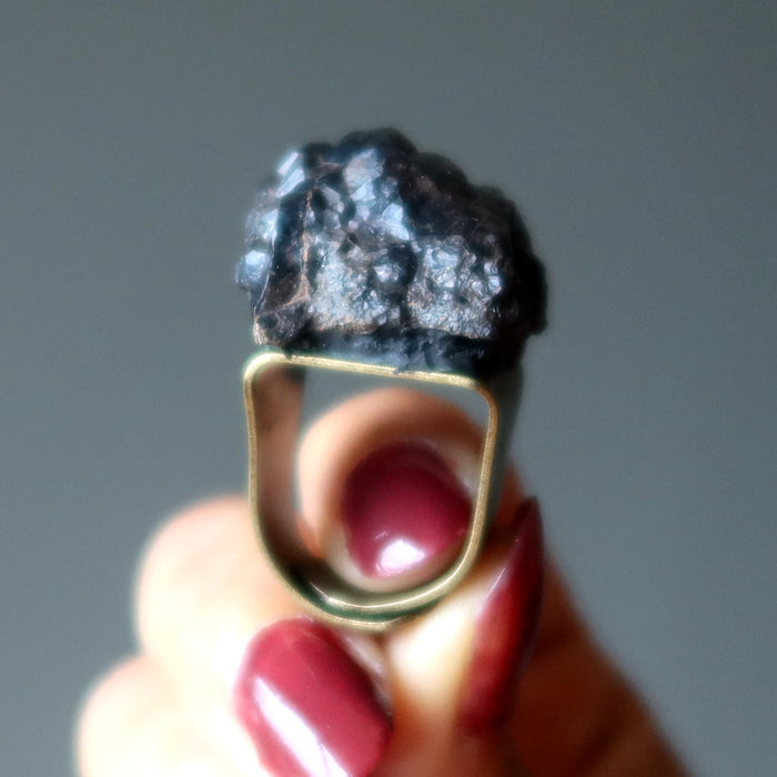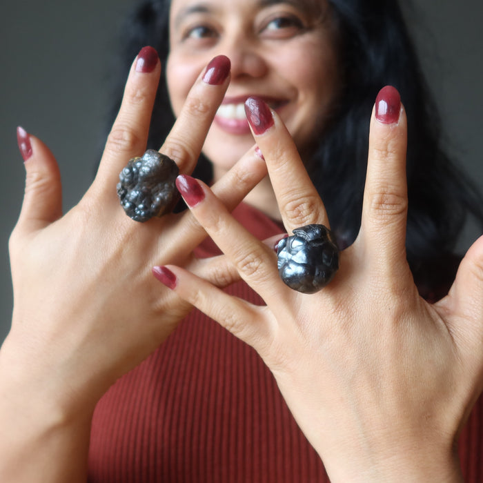 Your new ring features a natural and untreated Hematite stone. This dark metallic stone may show shiny faces or botryoidal bubbly formations. The rough cluster is chunky, weighty, and secured to the adjustable ring with a visible black sugru adhesive. Each stone is unique. Assembled in the Satin Crystals studio in the USA.