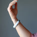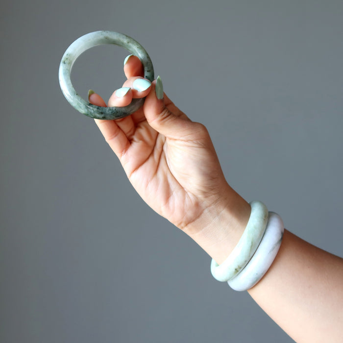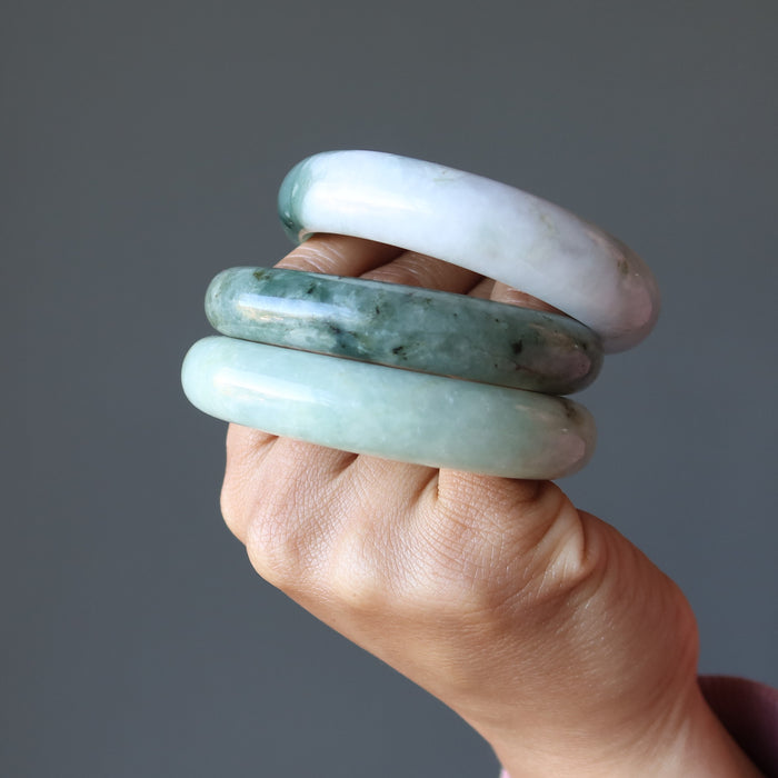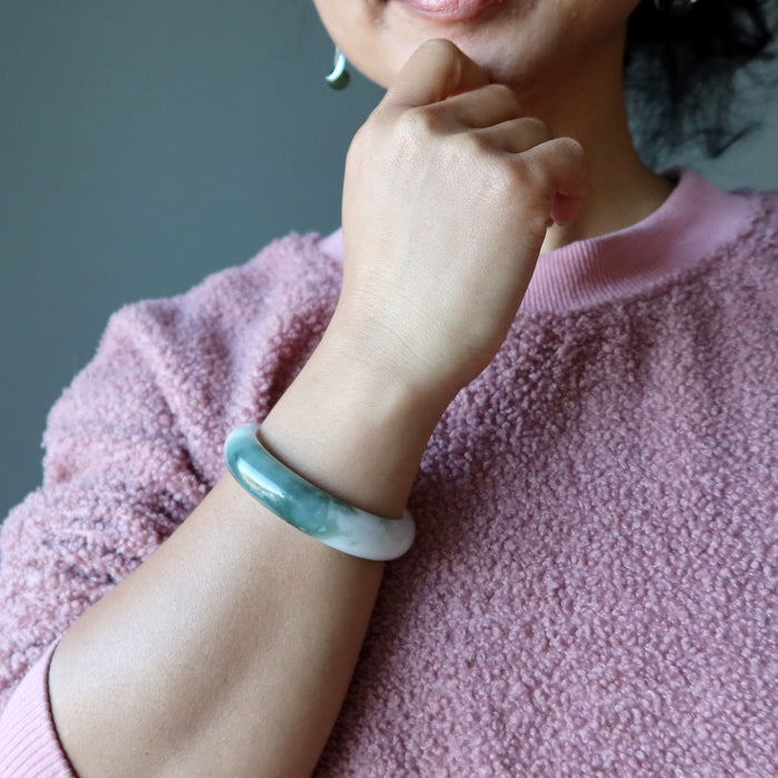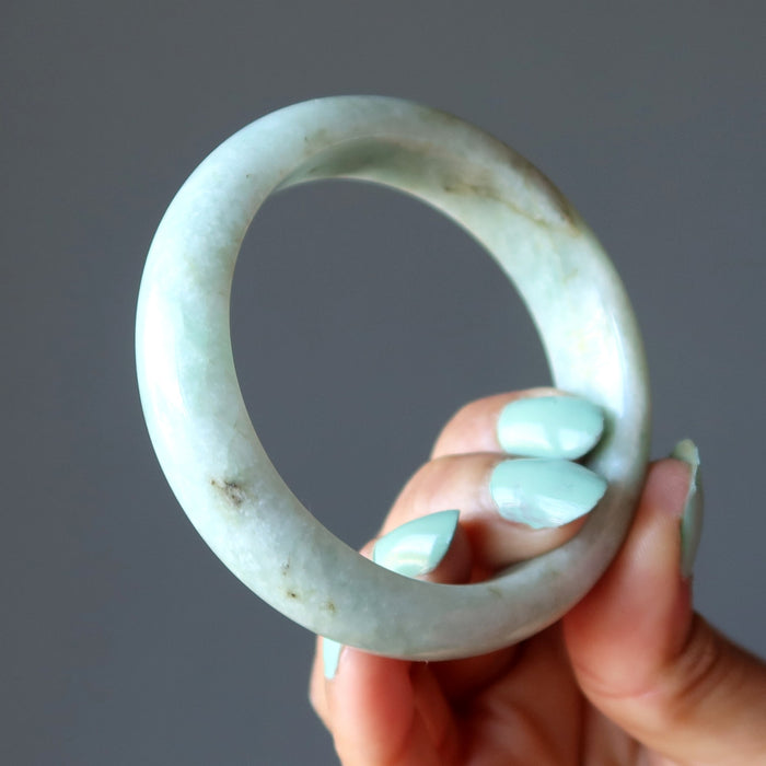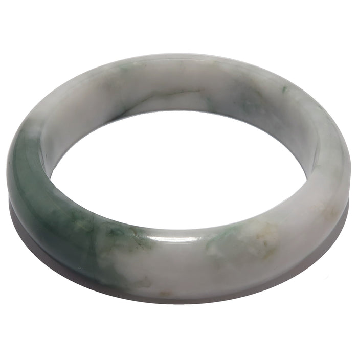 Your new bracelet features authentic Jadeite Jade from Myanmar (Burma). This is a creamy green and white stone varying in intensity. It may also show organic yellow or black minerals. The stone is polished into a domed bangle, flat on the inside and rounded on the outside.