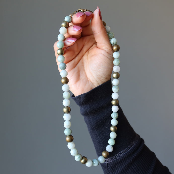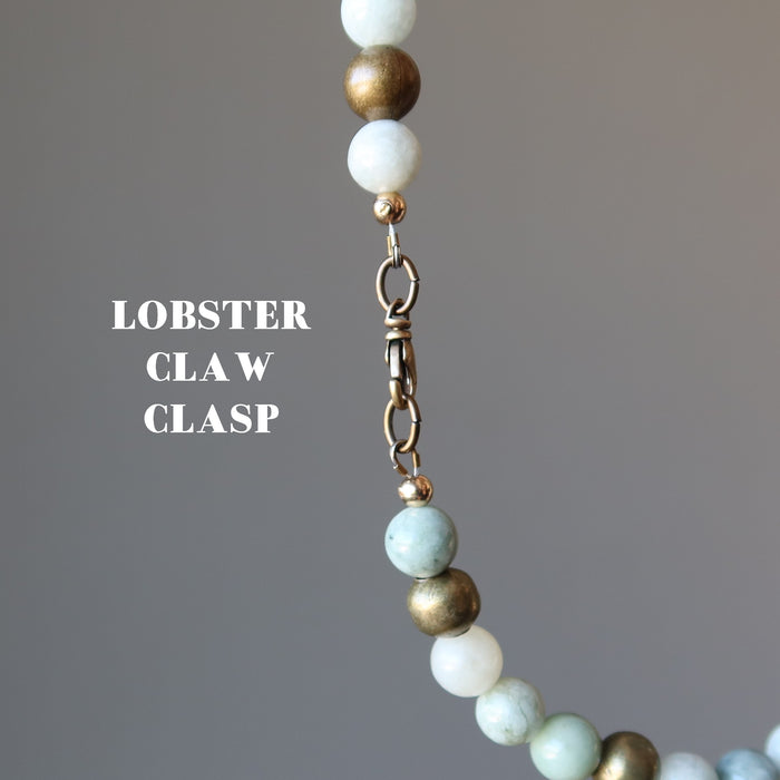 Your new necklace features natural Nephrite Jade. These are creamy-white to green stones polished into round-ish beads and beaded with antique brass accents. The necklace is secured with a lobster claw clasp. Each stone is unique. Beaded in the Satin Crystals studio in the USA.