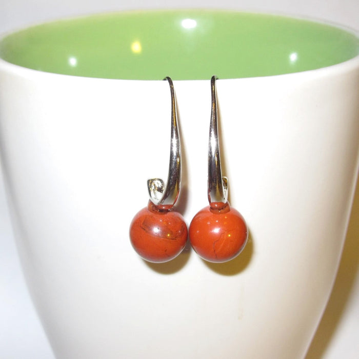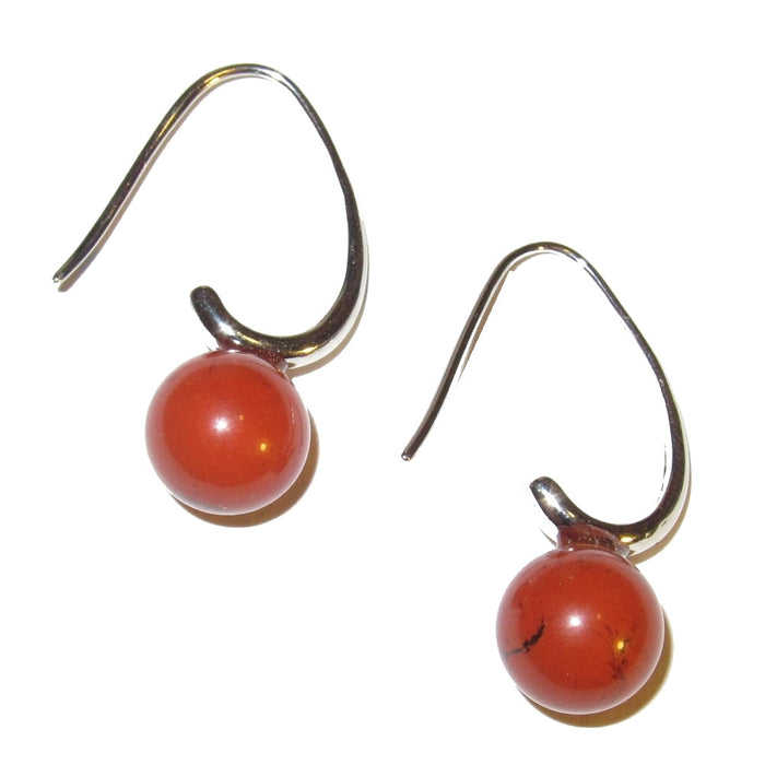Your new earrings feature genuine Red Jasper gemstones. These are bright red stones which may show black vein inclusions. The Red Jasper is polished into smooth round beads and hang from curved silver-plated earrings.