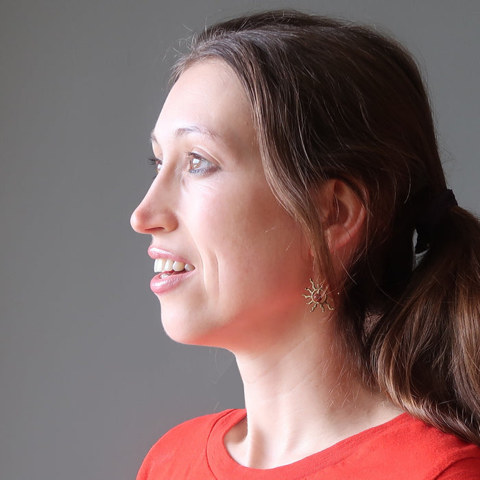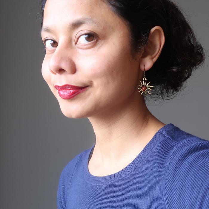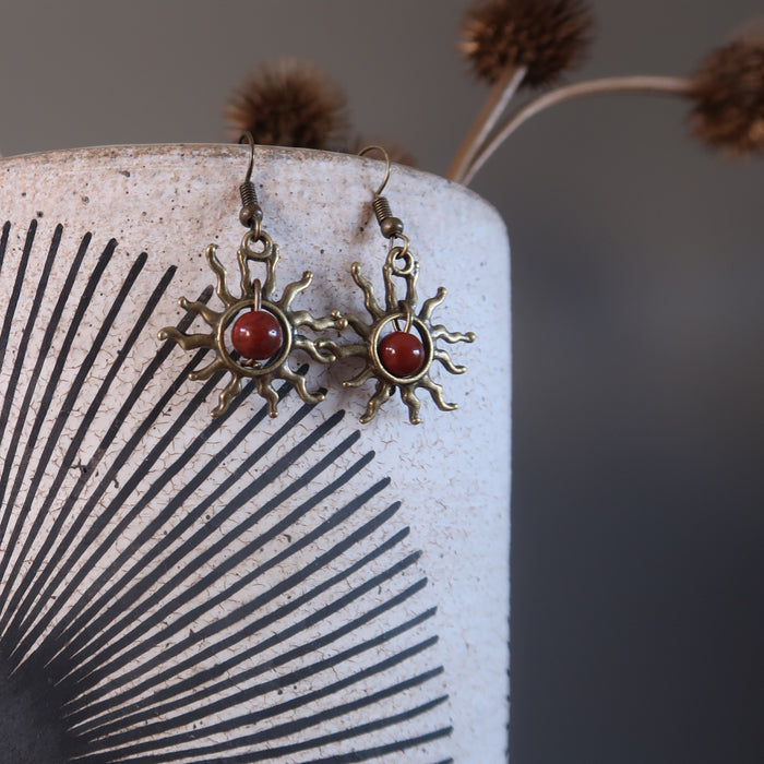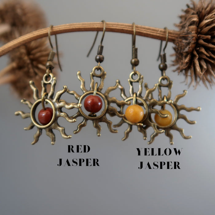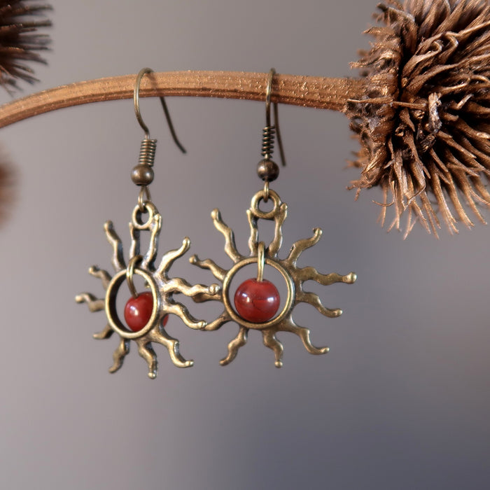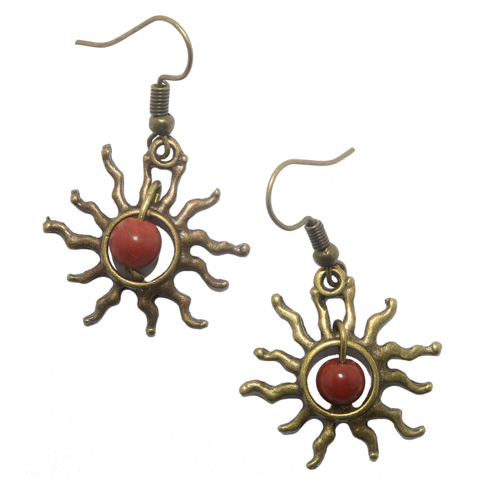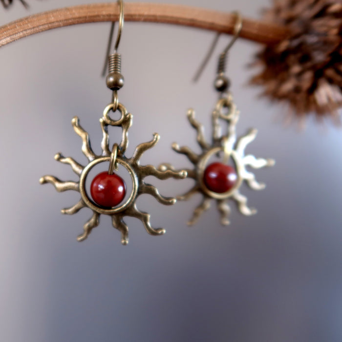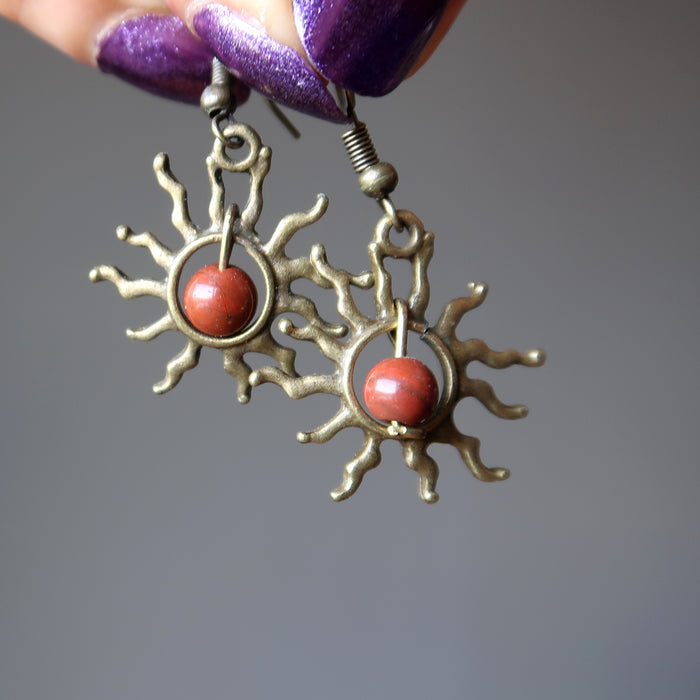 That fire that burns deep within the pit of your stomach lies in wait. Ignite your hidden passions by wearing these fiery sun earrings. Red Jasper burns with bold confidence. Let it infect you with its invigorating energies.