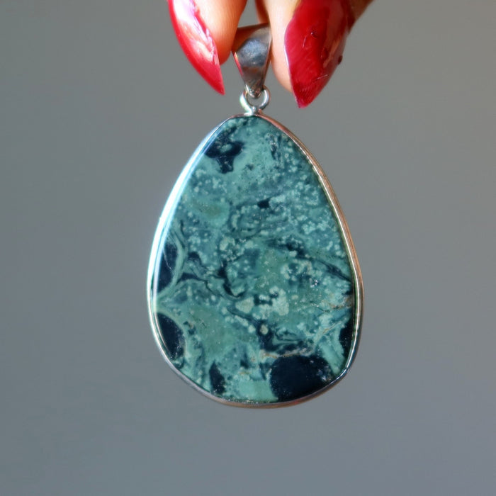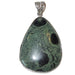 Your new pendant features a natural and untreated Jasper. This is a dark green stone swirling with black inclusions. The stone is polished into a smooth slab and set in a silver-plated pendant. Each is unique. Add a necklace chain.