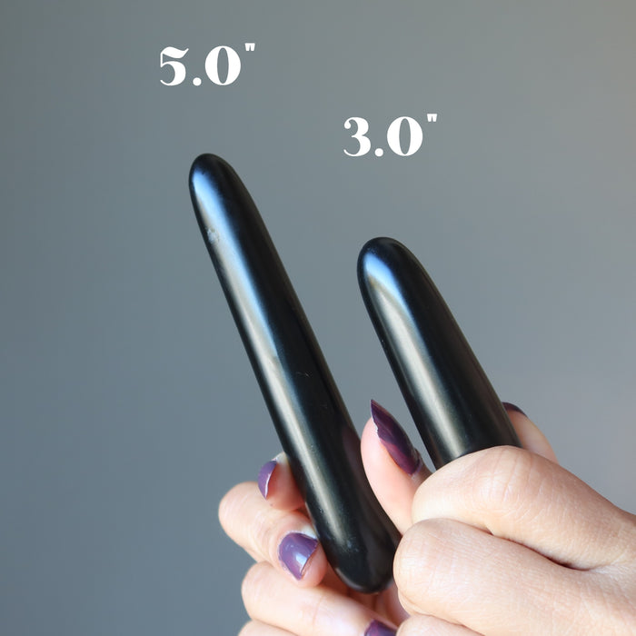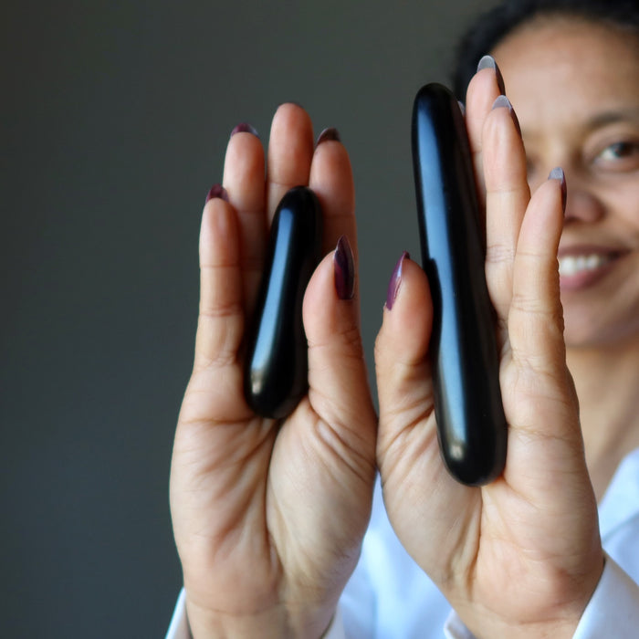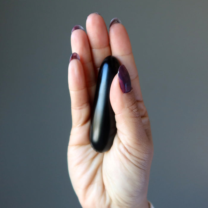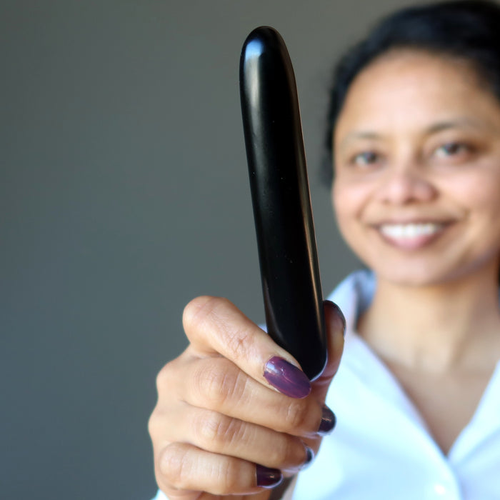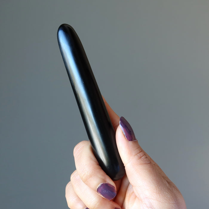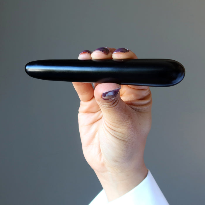Your new massage wand is polished from natural Jet stone. Jet is a real gemstone crystallized from ancient, waterlogged trees. It is very lightweight. The black stone is polished into a smooth wand rounded at both ends.