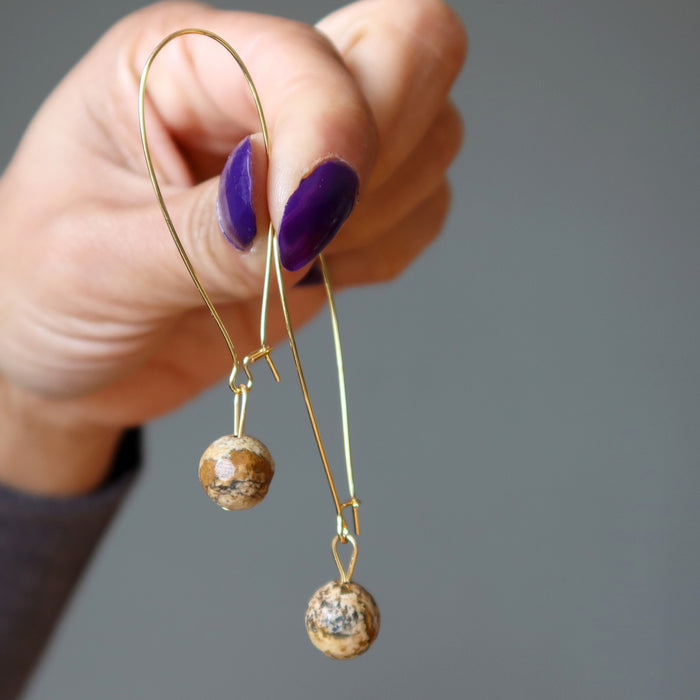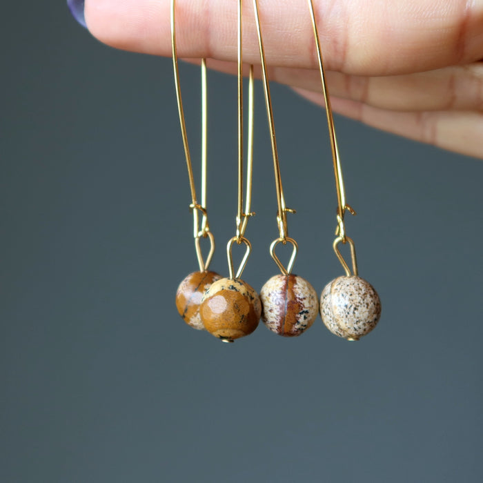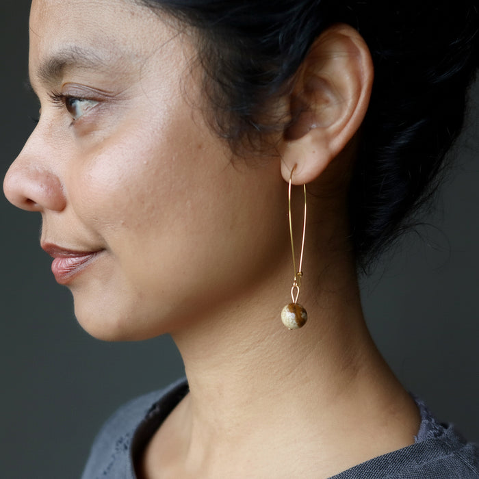 Your new earrings feature natural and untreated Landscape Jasper stones. These are creamy brown crystals showing unique patterns. They are polished into round stones and faceted to reflect the light. The beads hang from large gold-tone kidney wire earrings. Each stone is unique.