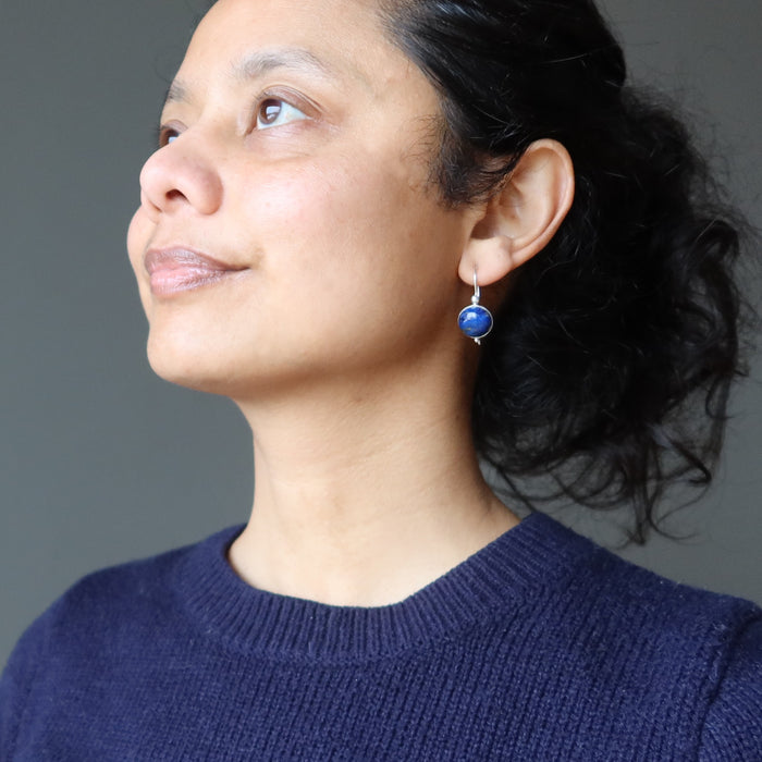 Your new earrings showcase natural and untreated Lapis Lazuli gems polished round and set on sterling silver wires secured with latches. Each stone differs. Assembled in the Satin Crystals studio in the USA.