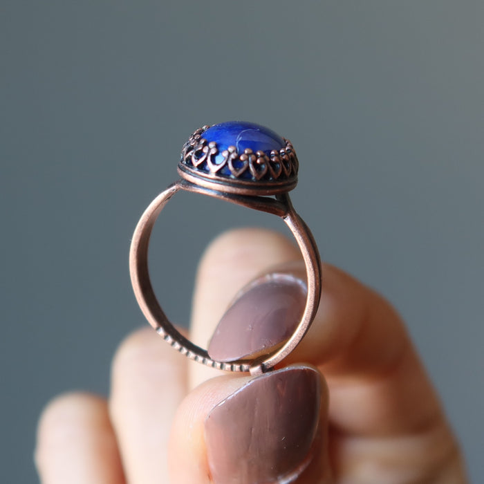 Catch the essence of the sky in this real Lapis Lazuli ring. Set in antiqued copper, the deep blue stone is perfect for gazing and reflecting upon your dreams. Hear the melody of the sky sing you songs of praise and encouragement any time you are lost or off track. Feel uplifted and secure when you wear this nostalgic Lapis gemstone ring.