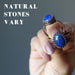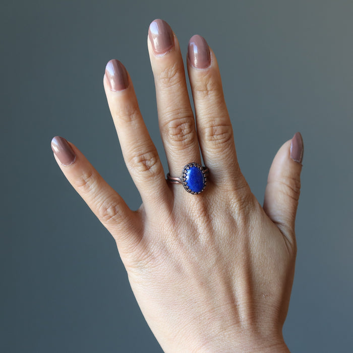 Your ring features natural and untreated Lapis Lazuli boasting royal blue tones, white Calcite, and gold Pyrite inclusions. The gemstone is polished into an oval cabochon and set in antique copper-plated brass. Each stone is unique. Assembled in the Satin Crystals studio in the USA.