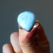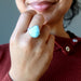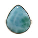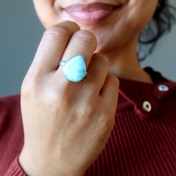 This Larimar ring is a blue beauty. Gaze into the dreamy blue teardrop gemstone and transcend the troubles of the world. A gorgeous blend of aqua blue and green puts your soul in a state of serenity.  You look and feel outstanding wearing the Larimar ring of beauty.