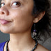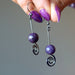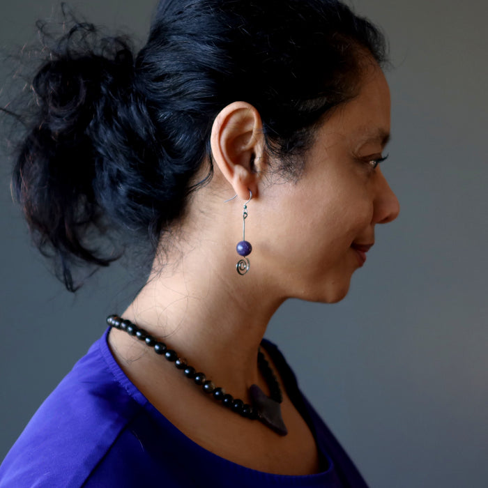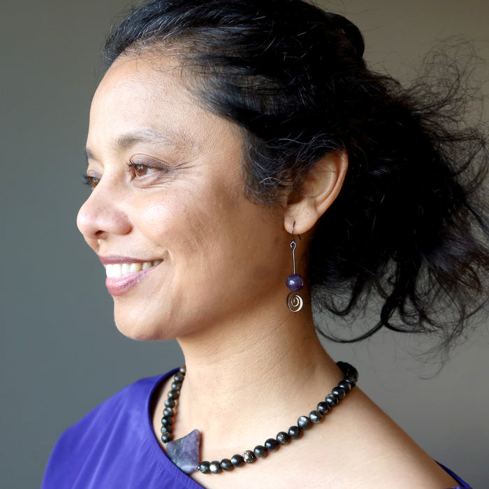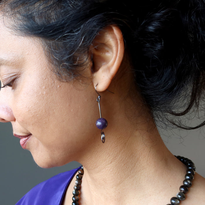 Your new earrings feature natural Lepidolite stones. These are purple polished into round beads. They hang from gunmetal-brass spiral earrings. Created in the Satin Crystals studio in the USA.