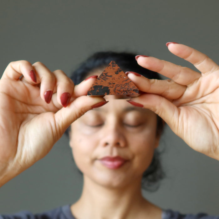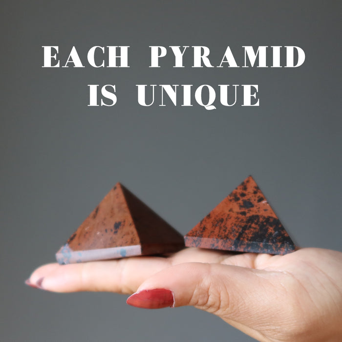 Your new pyramid is carved from natural and untreated Mahogany Obsidian from Mexico. This is a volcanic black stone with reddish-brown inclusions. Each stone is unique. Pyramid sizes are measured by width. Height may vary.