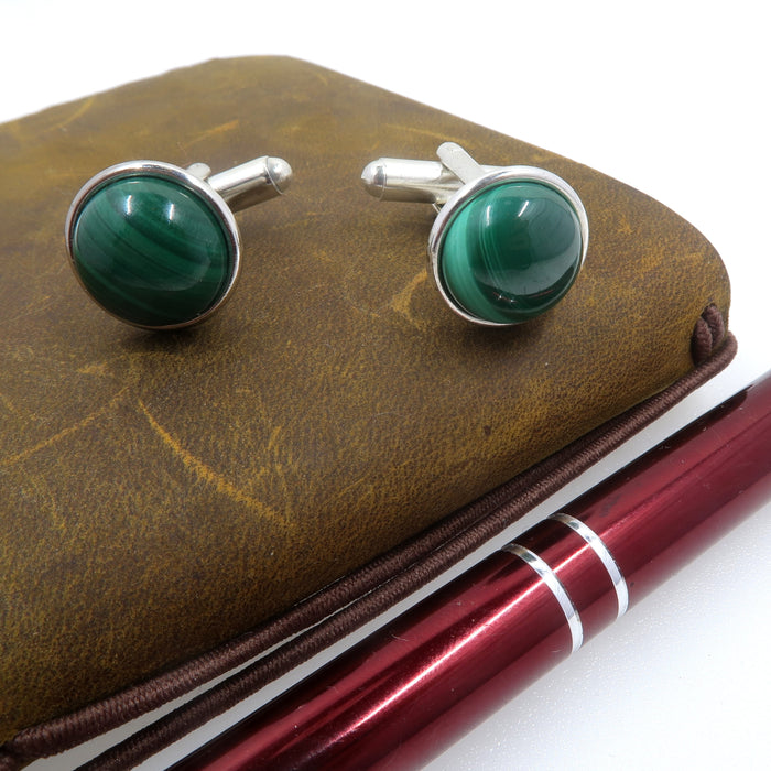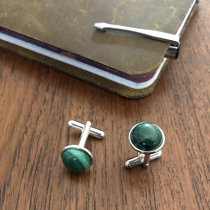 Travel the world in these striking green genuine Malachite cufflinks. Even when you remain local, just gazing into these artistic natural stones sends your soul in flight. Look and feel like a global citizen with these Malachite cufflinks at your sides.
