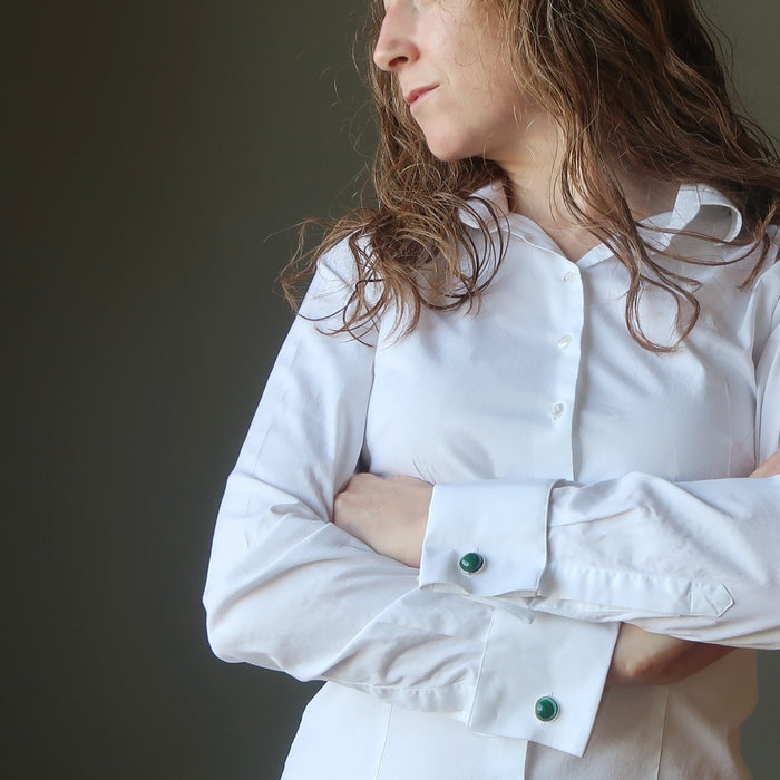 Your new cufflinks feature natural and untreated Malachite. These are green-banded polished into round cabochons. The gemstones are set in bullet-back plated brass. Easily flip the bullet clasps vertically to insert and horizontally to secure your double cuff shirts. Each stone is unique. Assembled in the Satin Crystals studio in the USA.