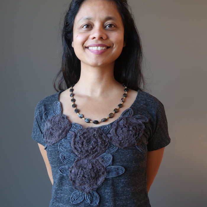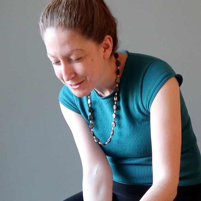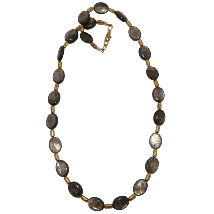 Your new necklace features genuine Mica gemstones. These are dark stones with a gray-gold sheen polished into oval-ish beads. The Mica is beaded with textured gold capsule beads on a necklace secured with a lobster claw clasp.