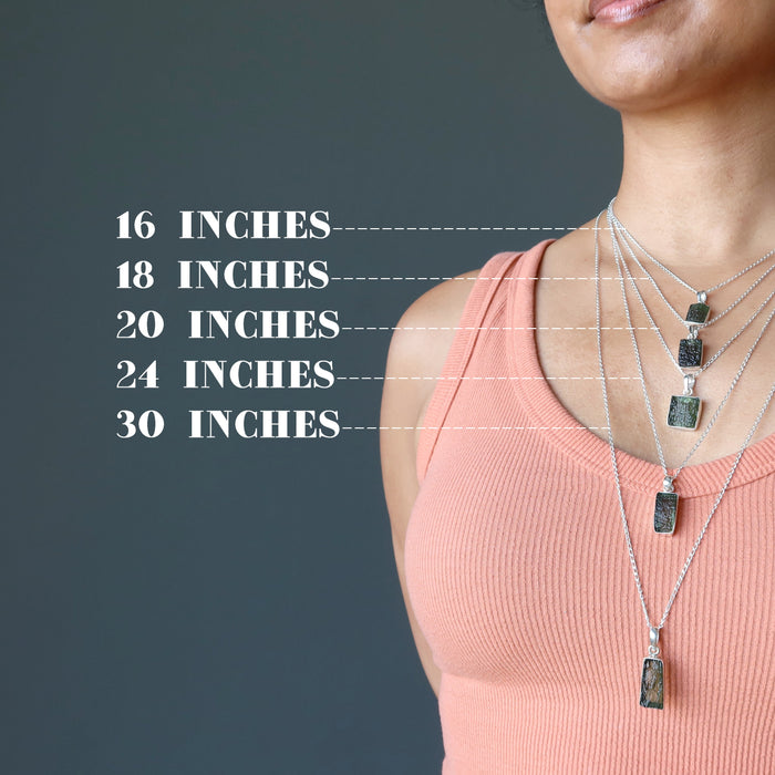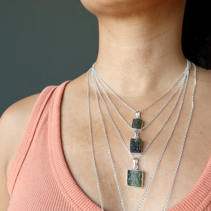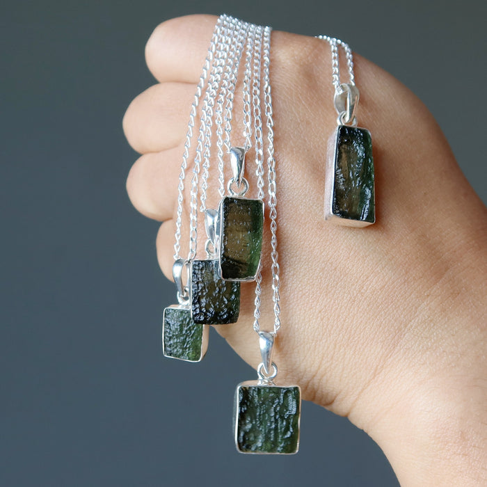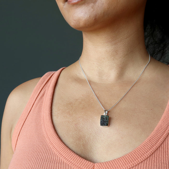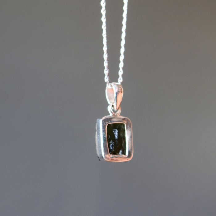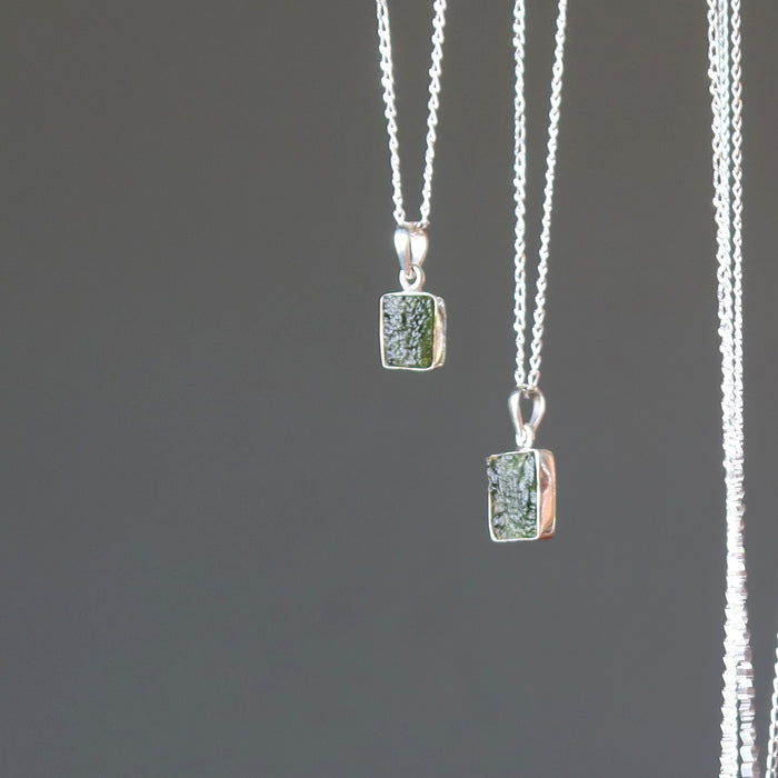 Your new necklace features genuine, untreated Moldavite from the Czech Republic. This is a rough green Tektite shaped into a rectangular cabochon and set in a sterling silver pendant. The pendant hangs from a curb chain sterling silver necklace with a spring clasp. Each Moldavite is unique.