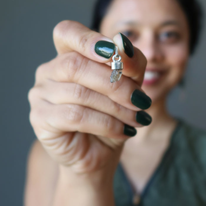 Your new pendant features genuine and untreated Moldavite from the Czech Republic. This is a translucent green Tektite in its raw formation set in sterling silver. Each stone differs. Add a necklace chain.