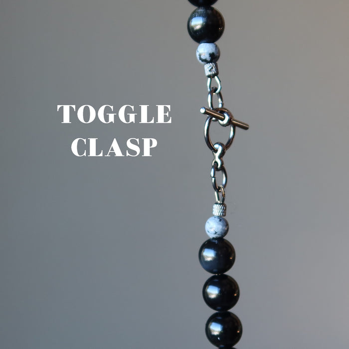Your necklace showcases natural and untreated Rainbow Obsidian gemstones. These are black shiny stones showing a subtle rainbow-colored sheen. The sheen is best seen under direct light. The stones are polished into round beads and strung with blue ceramic beads. The necklace is secured with a gunmetal toggle clasp. Beaded in the Satin Crystals studio in the USA.
