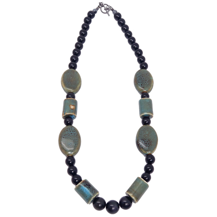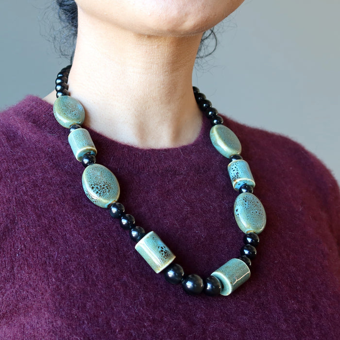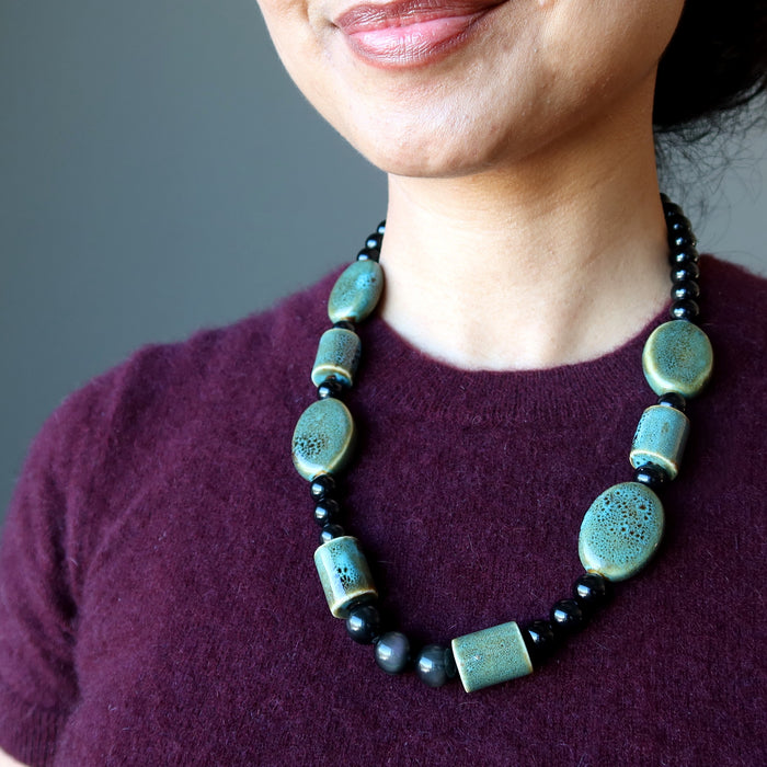 Keep your energies protected with this genuine Rainbow Obsidian necklace. This necklace is strung with round, black, volcanic Obsidian stones showing subtle rainbow sheen and bold blue-green ceramic beads. Big and powerful, this statement piece is ready for you to be the jewel of the earth.