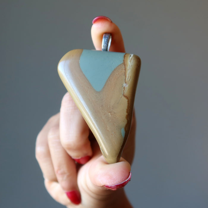 Your new pendant features a natural and untreated Jasper. This is a picturesque brown and gray stone polished into a smooth triangular slab. The Jasper is set on a silver-tone heart bail and can be worn on your favorite necklace chain. It is one-of-a-kind. Add a necklace chain.