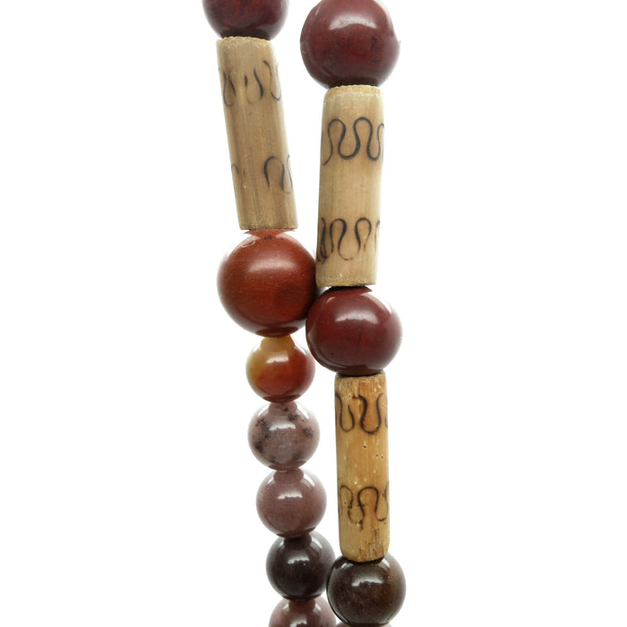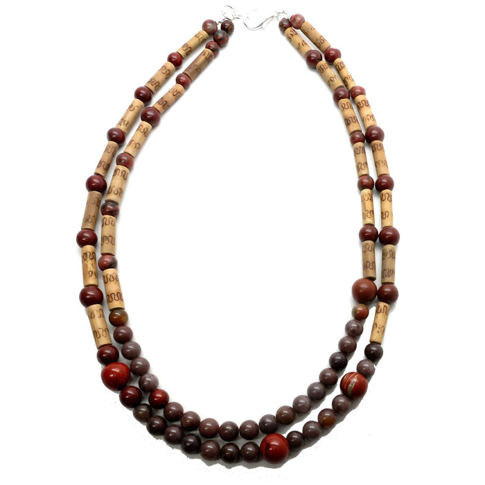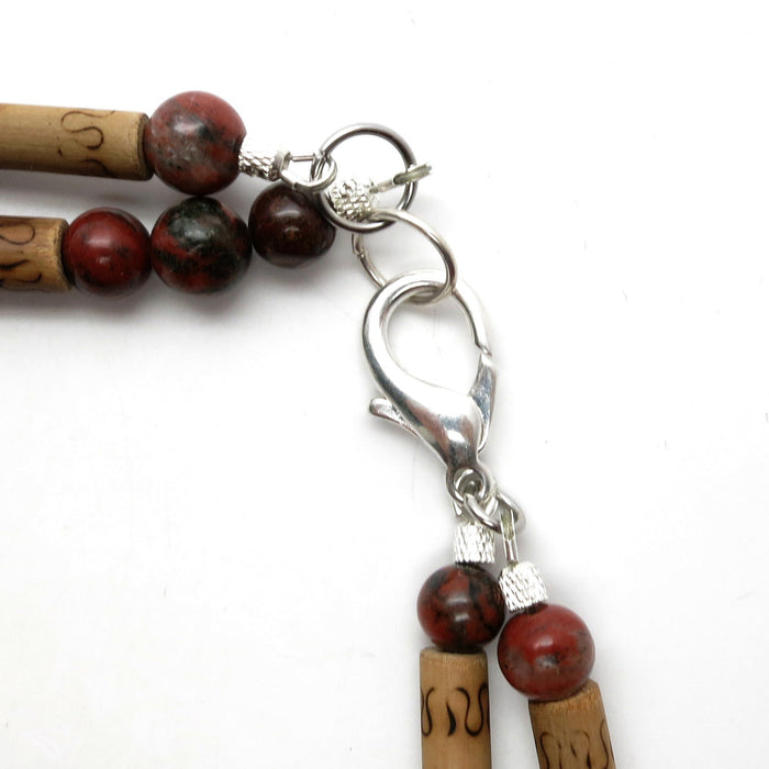 Take a ride on the wild side with this double strand gemstone necklace beaded with squiggly patterned bamboo beads. The brown wood tubes are strung with brick Red Jasper and purple Aventurine rounds. The one-of-a-kind crystal healing necklace is secured with a silver-plated lobster claw clasp.