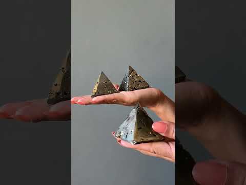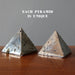 Your new pyramid is polished from natural and untreated Pyrite from Peru. This is a shiny golden metallic stone that may show white Quartz spots. Each stone differs; retaining natural pits, grooves, veins, and inclusions. As a hand-polished piece, the edges will not be machine-perfect. Pyramids are measured by width; height will vary.