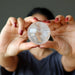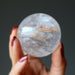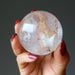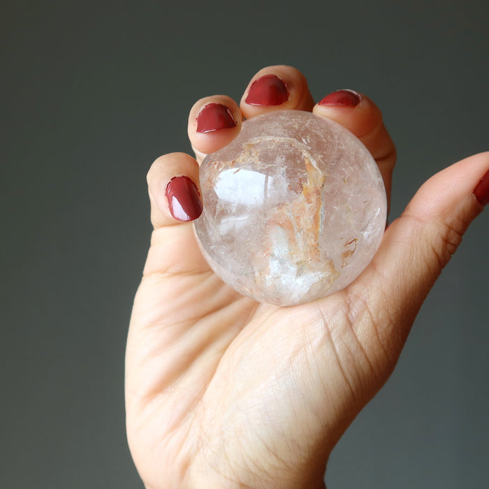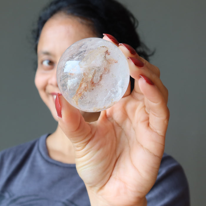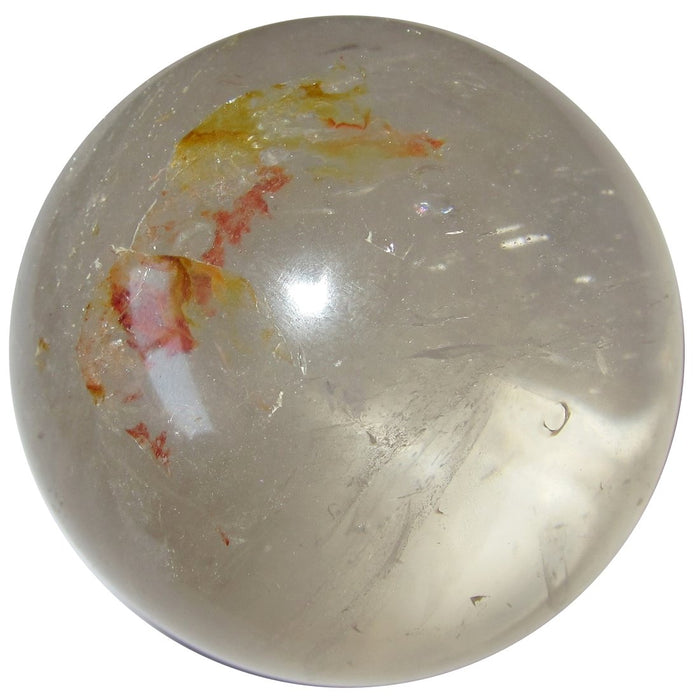 Your new crystal ball features natural and untreated Clear Quartz. This is a very clear stone full of natural inclusions, veins, and craters. Within the stone are red, orange, and/or golden Iron inclusions that look like flames of fire. You might also find traces of other phenomena like rainbows, minerals, rivers, and vugs. Each sphere differs. Showcase your crystal ball by adding a display stand.