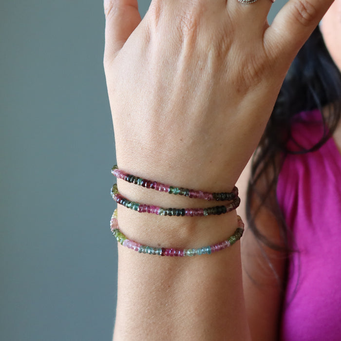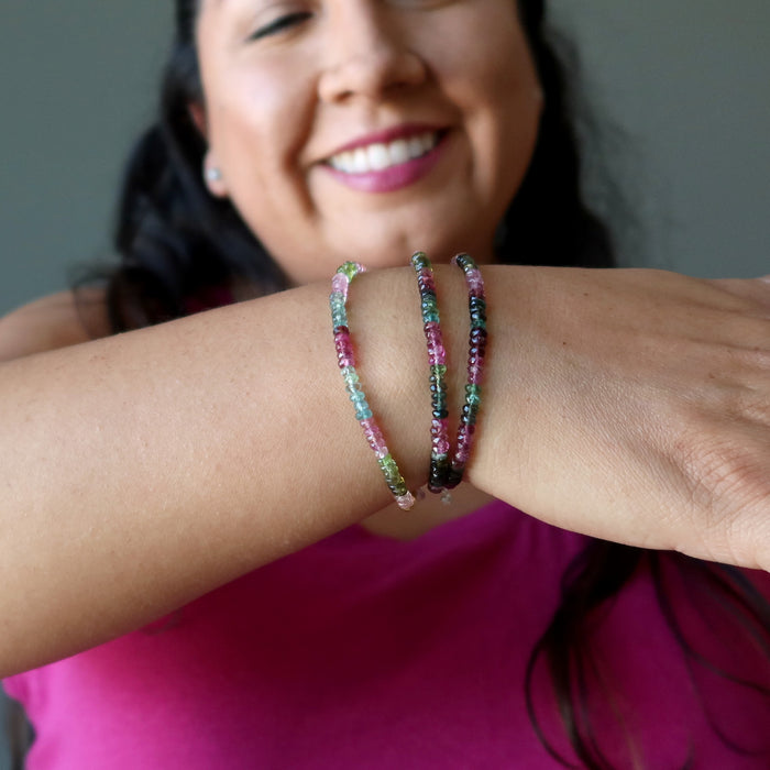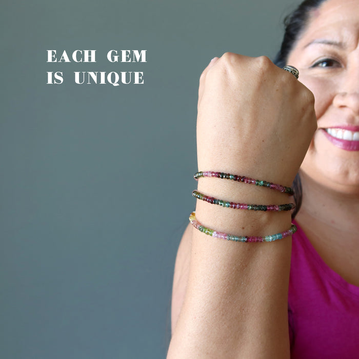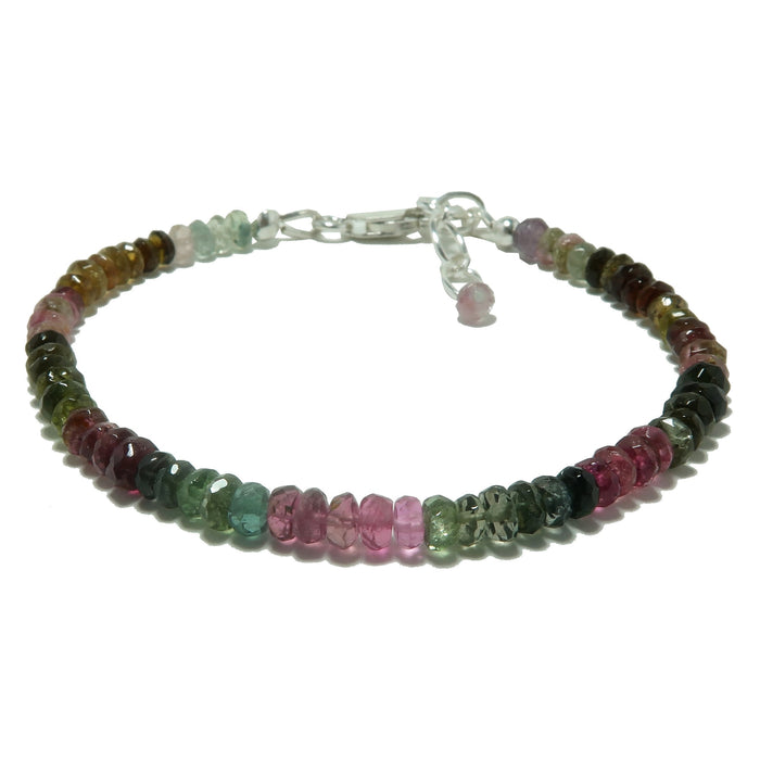 Your bracelet showcases natural and heated Rainbow Tourmaline gemstones. These are multi-colored, faceted beads strung on a sterling silver clasp bracelet with an extension chain. Each stone differs.
