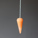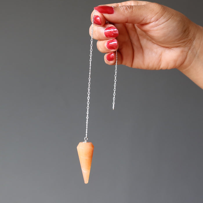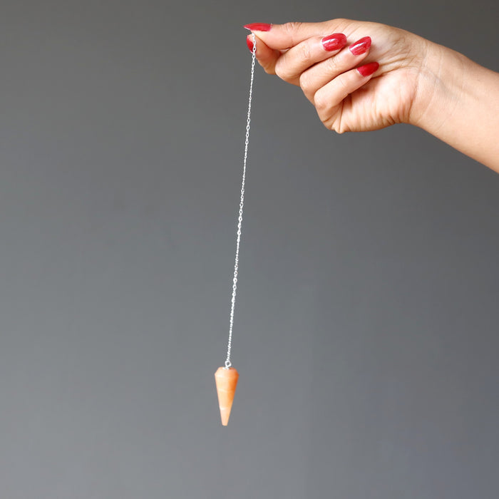 Your new pendulum features natural and untreated Red Aventurine. This is a reddish-orange stone faceted into a point and hung from a sterling silver chain. Each stone is unique. The pendulum has a ring at the top for easy holding or hanging.