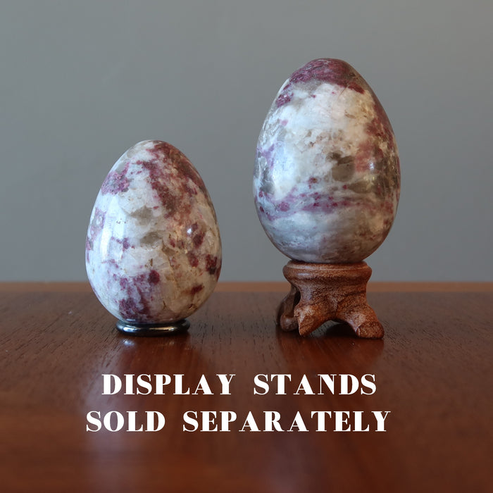 Your new egg is polished from natural, untreated Red Tourmaline known as Rubellite. Raspberry-toned gems form bold patterns in a Quartz and/or Smoky crystal backdrop. The stone is polished into an egg, smooth but retaining deep surface dips and craters. Showcase your egg by adding a display stand.