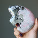 Your love is timeless, spanning many lifetimes and beyond. This giant Rhodonite bear captures the endless spirit of your love. Carved in the ancient totem form, the pink spirit animal whispers secrets of the past, present, and future. The Rhodonite bear is a big and powerful crystal for ensuring your best relationships last forever.