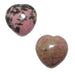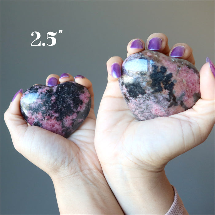 Your new hearts are polished from natural and untreated Rhodonite. This is a pink stone with black and brown inclusions. Each is unique. Hearts are measured by width.