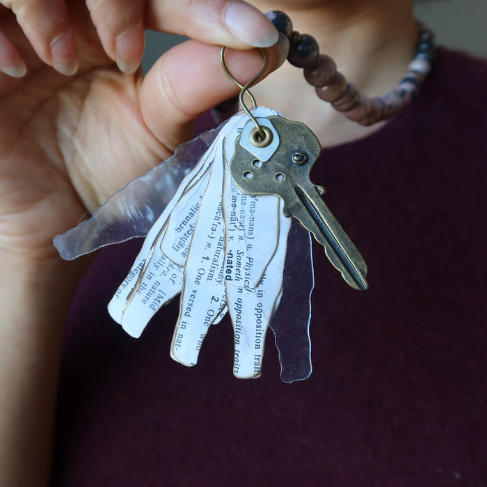 Your new necklace features natural and untreated Rhodonite. This is a pink stone with black mineral inclusions beaded on a necklace secured with a large lobster claw clasp. The pendant features an old key and cutouts from an old dictionary. This is a one-of-a-kind necklace.