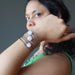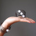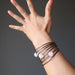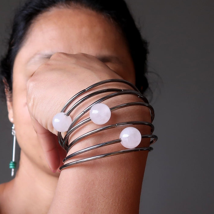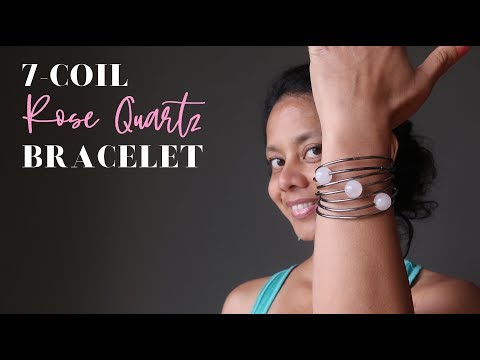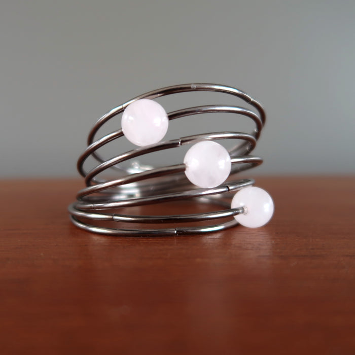 Your bracelet showcases natural and untreated Rose Quartz. The translucent, light pink Rose Quartz is polished into smooth round beads and beaded with gunmetal curve beads on 7 coils of memory wire. Beaded in the Satin Crystals studio in the USA.