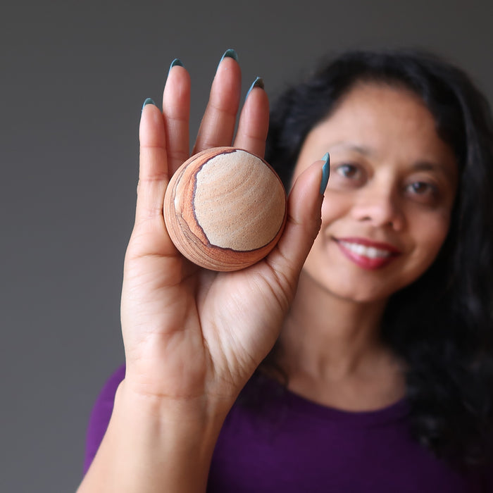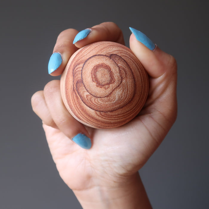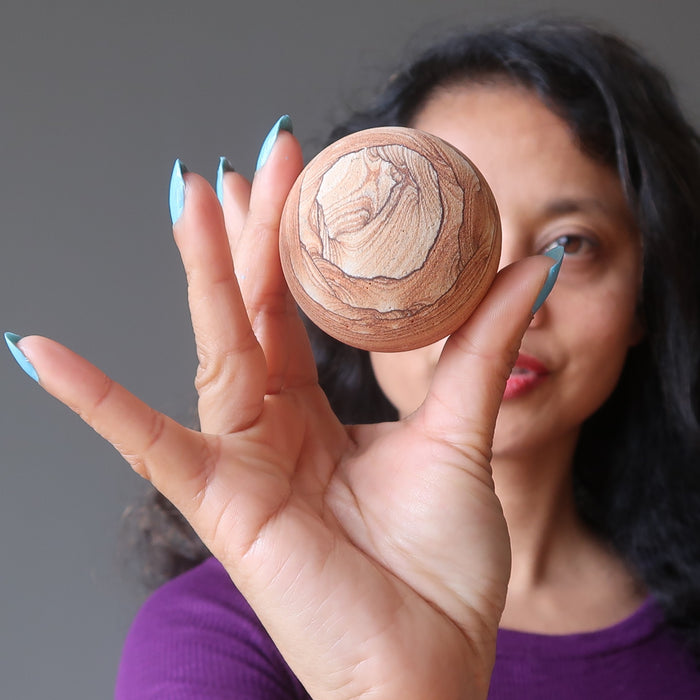 This Sandstone sphere tells a story about a time. Gaze nostalgically into the grainy desert landscape to take a shamanic journey into the insightful past and toward the hopeful future. Rugged Sandstone boasts brilliant patterns of natural sunrises and rocky terrains.